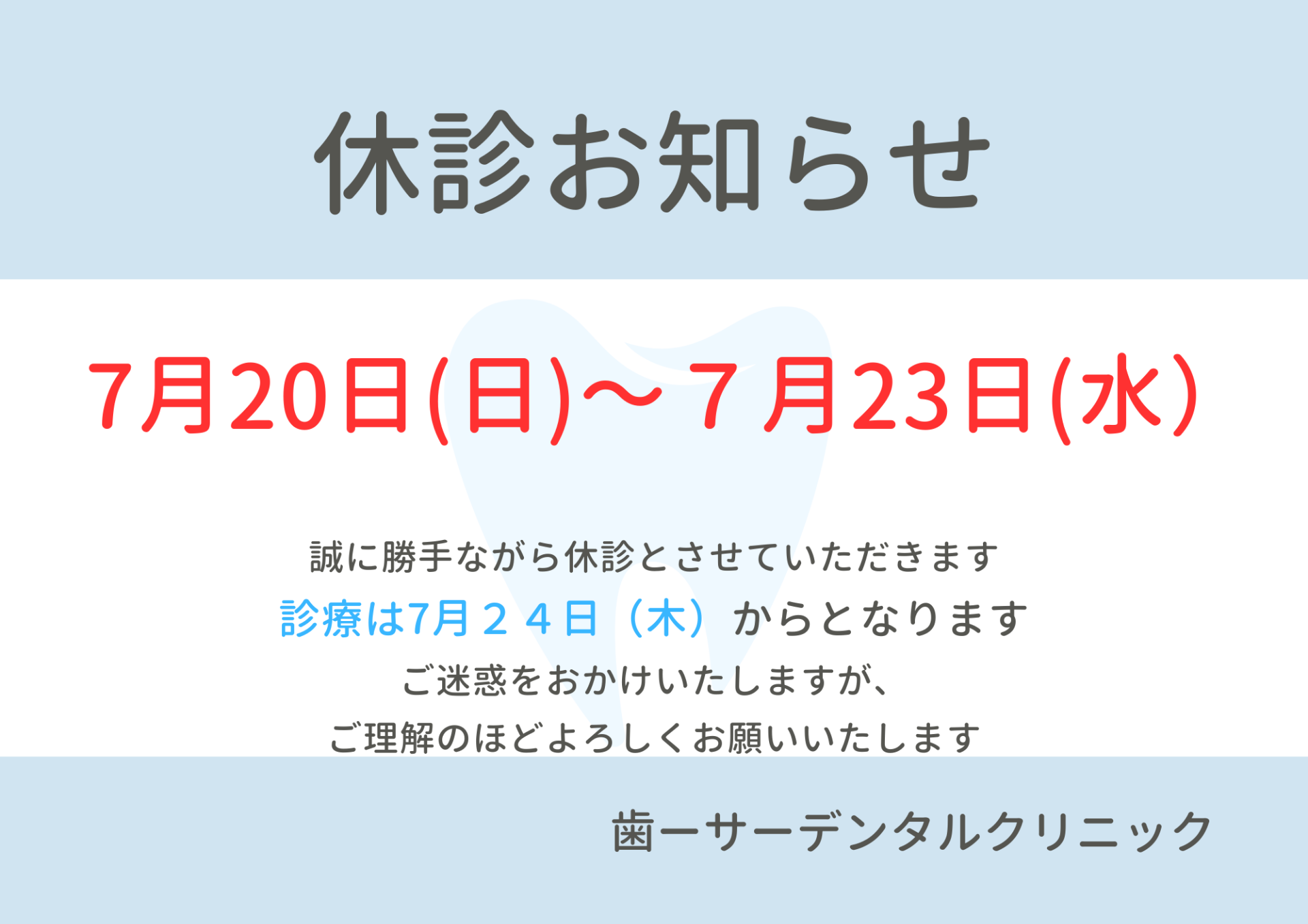【豊見城市の歯医者】連休にはいります 2025/07/20 7月20日(日)~7月23日(水)は臨時休診になります ご迷惑お掛けしますがよろしくお願い致します また、7月24日(木)から通常診療となります ニュース