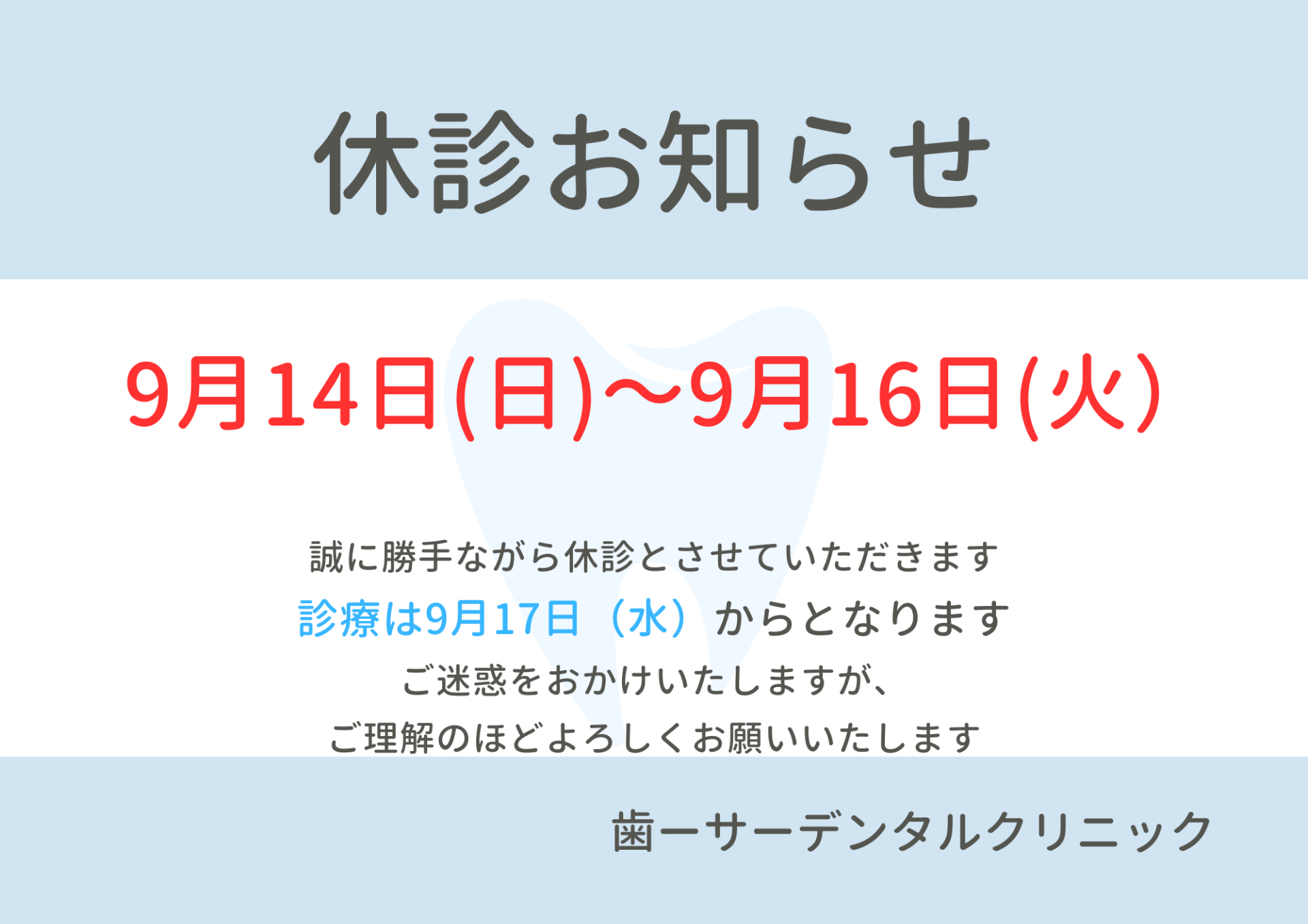 【豊見城市の歯医者】9月14日~16日休診 2025/09/14 おはようございます☀ 9月14日(日)~16日(火)まで休診となります 水曜日は定休日でずが17日(水)から診療となっています お間違えように宜しくお願いいたします! 不安定な天気を続いていいます💦 急な大雨のありますので足元にお気をつけてご来院ください また17日(水)からお待ちしております^^★ ニュース
