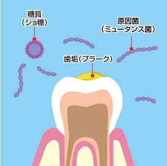 虫歯は、口の中にいる細菌が食べ物の糖分をエサにして酸を作ってその酸が歯を溶かすことで発生します。